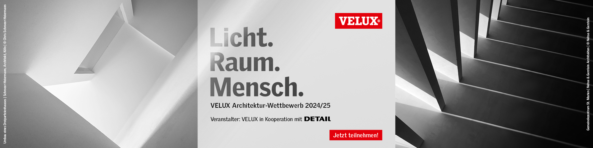 Tageslicht prägt Räume und begeistert Menschen. Dadurch wird es zu einem der mächtigsten Werkzeuge in der Architektur. Um diese Bedeutung zu würdigen, prämiert der VELUX Architektur-Wettbewerb 2024/25 die besten Tageslichtlösungen in Gebäuden aus Deutschland, Österreich und der Schweiz. Einzige Bedingung: Diese müssen unter anderem mithilfe von VELUX Lichtlösungen (Dachfenster, Dachfenster-Kombinationen oder Flachdach-Fenster) umgesetzt worden sein.